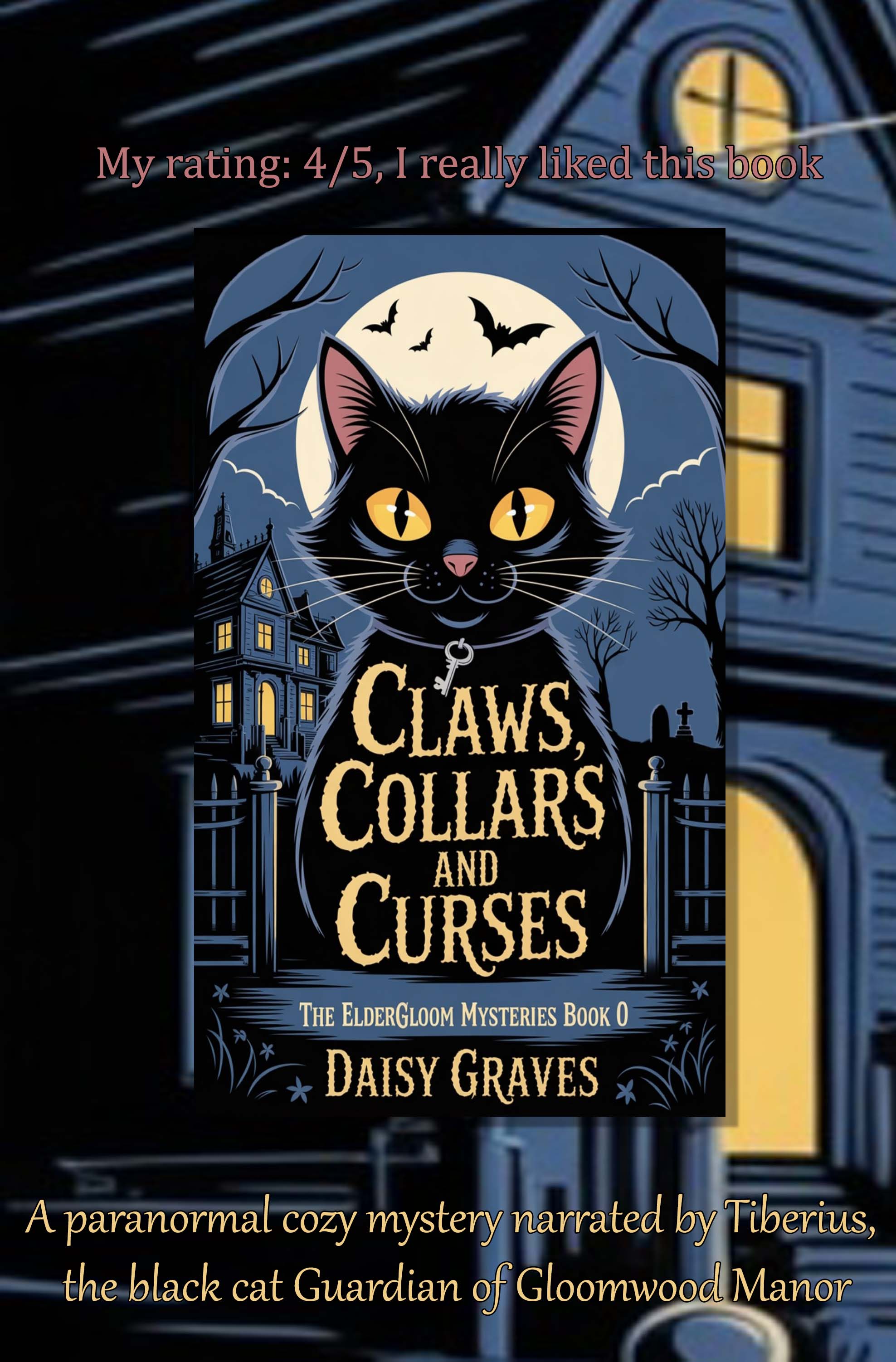 A cute, funny, 75 pages paranormal cozy mystery prequel novella to the Eldergloom Mystery series. Funny, engaging and really well written, this mystery short story is a treat for cat lovers and paranormal mystery readers. A great introduction to Daisy Graves’ books that will leave the reader wanting to jump straight into the whole series to read more about Tiberius and the witchy coastal town of Eldergloom.
