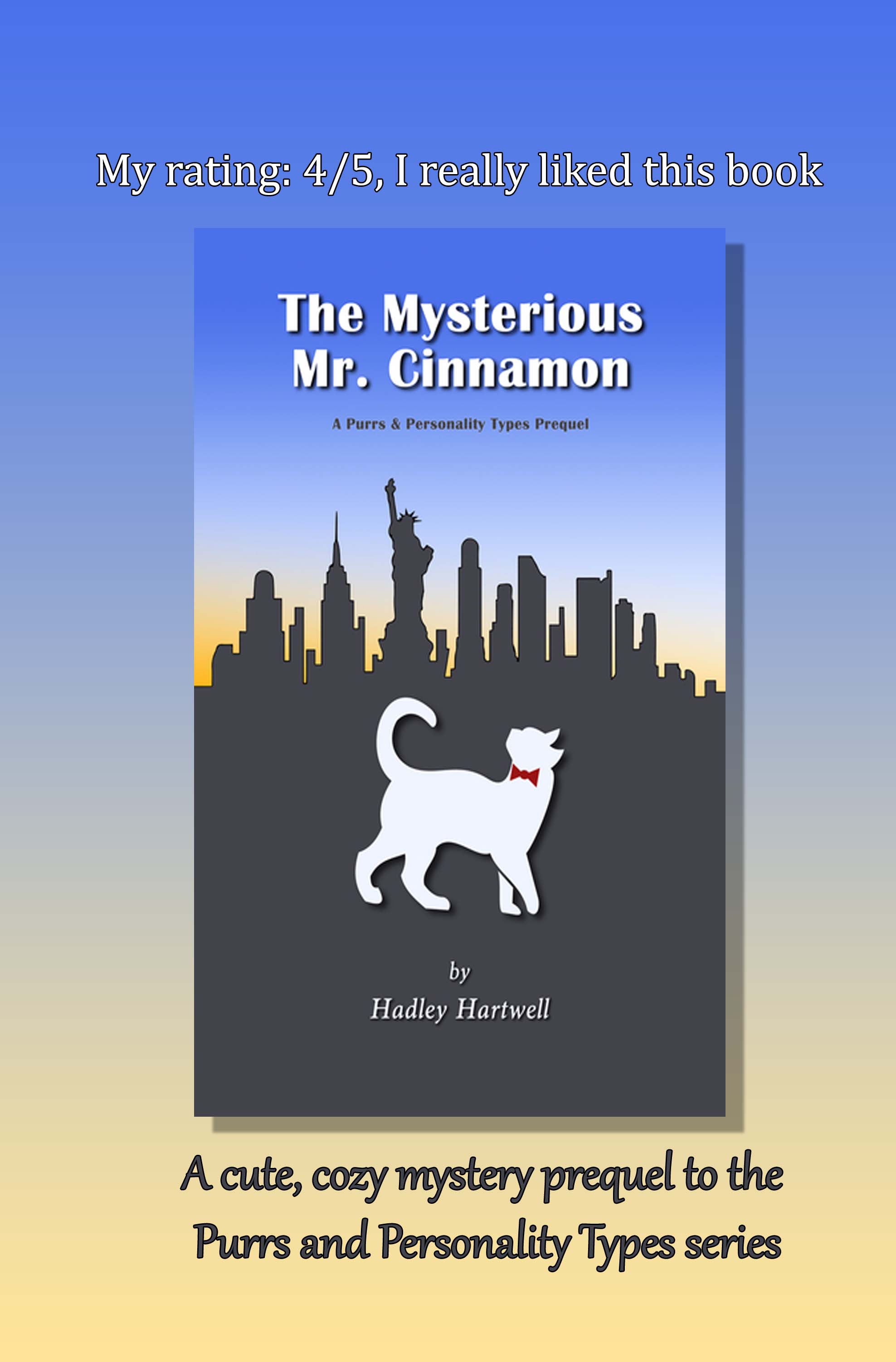 A cute, cozy mystery prequel. Constance is a woman who, even in her darkest hour has the compassion to care for a cat on the streets, and I hope that her story in the books will be one of positive change and a new outlook on life. Mr. Cinnamon, the titular cat, is absolutely adorable and the descriptions of him are fluent and natural and should make any cat lovers want to pick up the Purrs and Personality Types series.